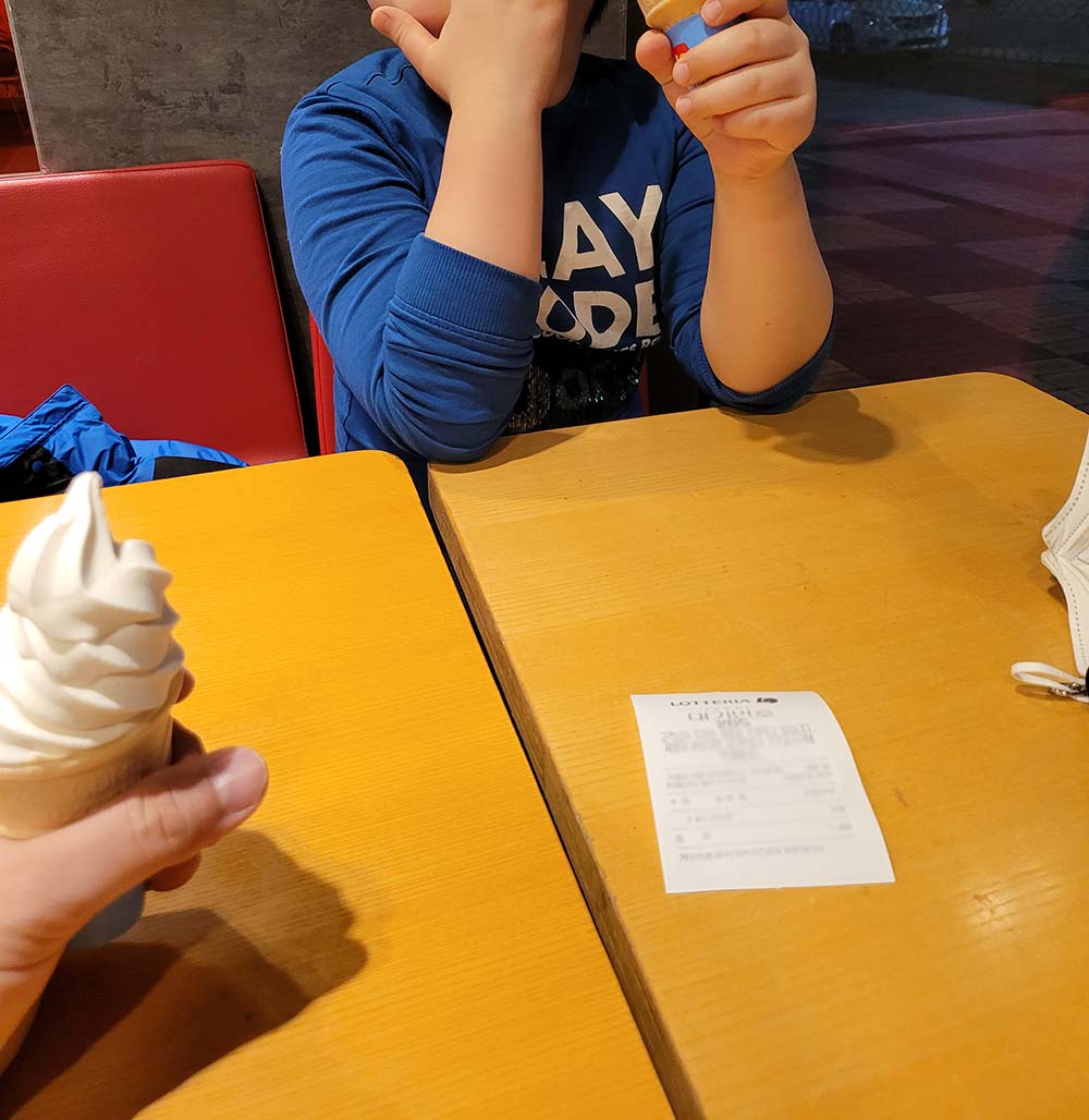롯데리아에 들러 아이스크림을 한개씩 손에 들었다.